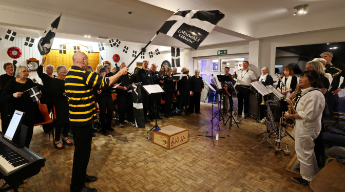 St Ives Bay Community Choir, was led by William Thomas, with Alison Ashby as our accompanist. As it was St Piran’s Day, the choir wore black with the addition of a white rose with Cornish tartan. St Piran is the patron saint of Cornwall and tin miners. On this day across Cornwall people celebrate their identity, culture and heritage.