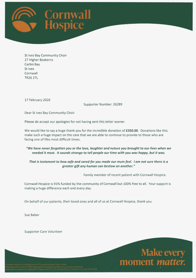 Thank you letter from Cornwall Hospice Care